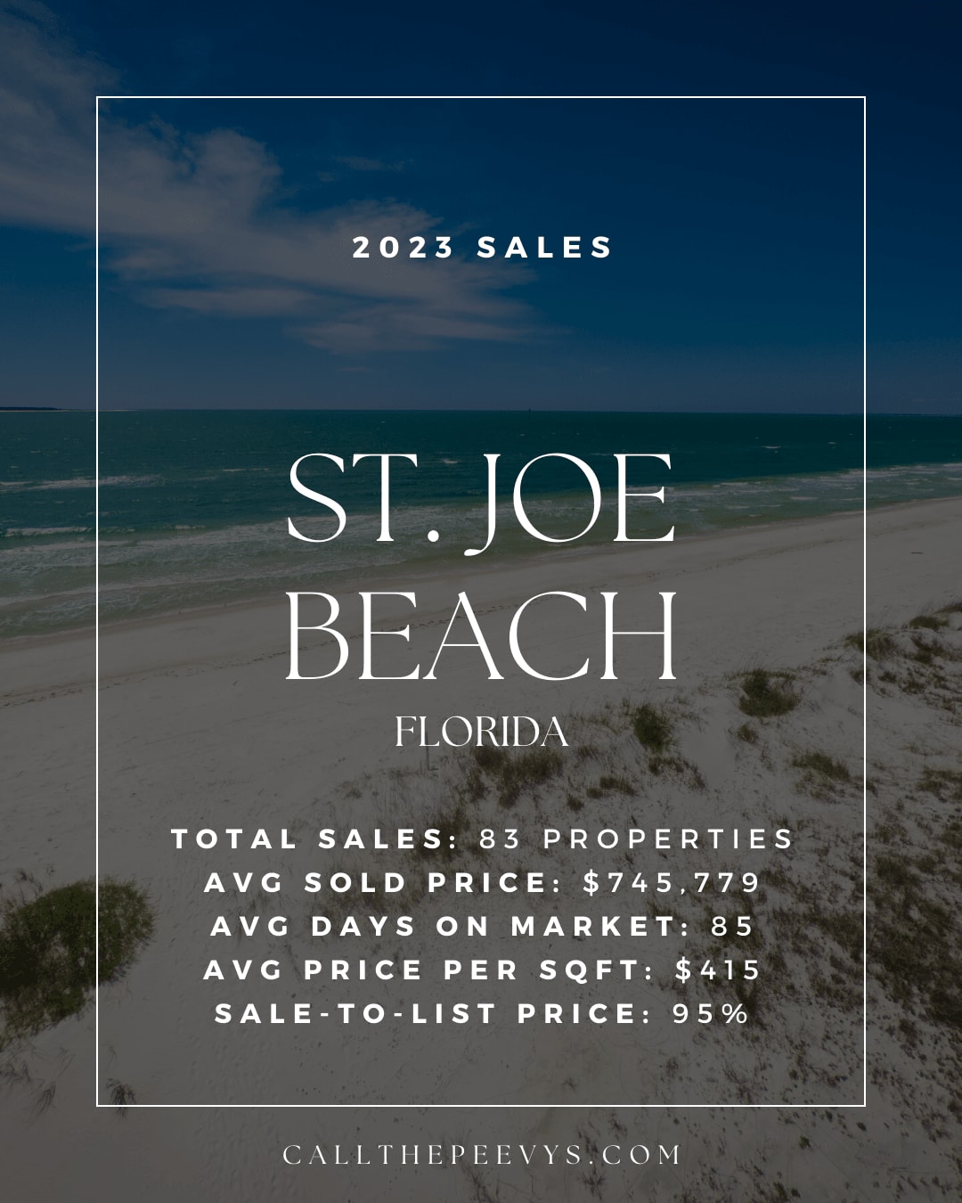 The charm of St. Joe Beach lies in its family-friendly atmosphere and the pristine shoreline that defines it. In 2023, the real estate market flourished, attracting families looking for a beachside haven. Residents here savor beach picnics, biking along scenic trails, and engaging in community events that foster a close-knit neighborhood vibe. The total properties sold for the year came to 83 with the average days on market being 85 days. Average price per square foot of properties sold was $415, and an average sale price of just over $745,000. The Peevy’s had the highest priced sale for the entire year in St. Joe Beach at $2,900,000!🥇