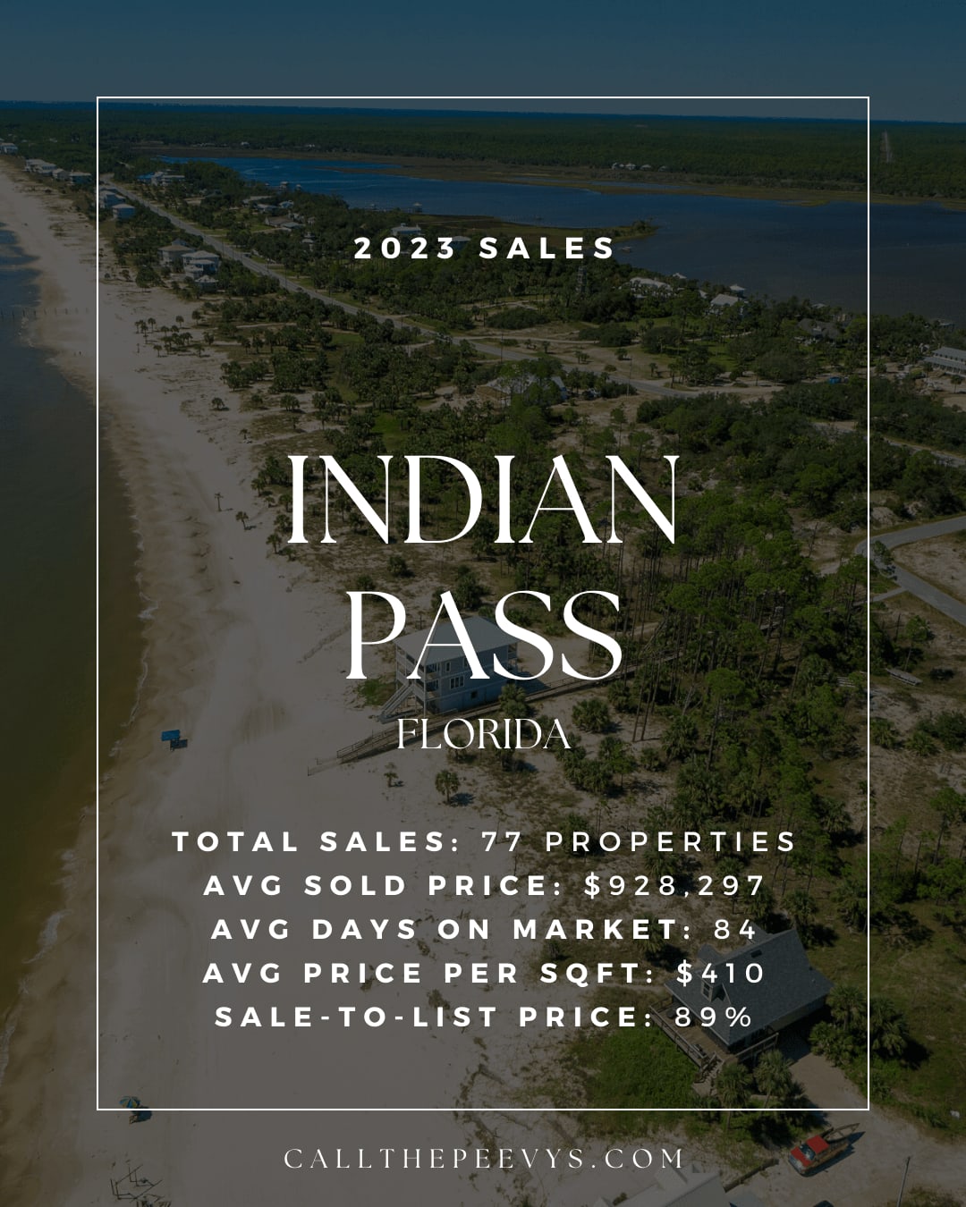 Tucked away from the hustle and bustle, Indian Pass offers a tranquil escape for those seeking a slower pace of life. Real estate sales in 2023 reflected a growing interest in this hidden gem. Residents enjoy kayaking in the Indian Lagoon, exploring nature trails, and indulging in fresh seafood from local markets. Indian Pass saw a total of 77 properties sold for 2023 with an average days on market of 84. The average price per square foot came to $410 with an average sale price of $928,000. Yet again for 2023, The Peevys marked the highest sale price on Indian Pass for 2023 at $2,900,000!