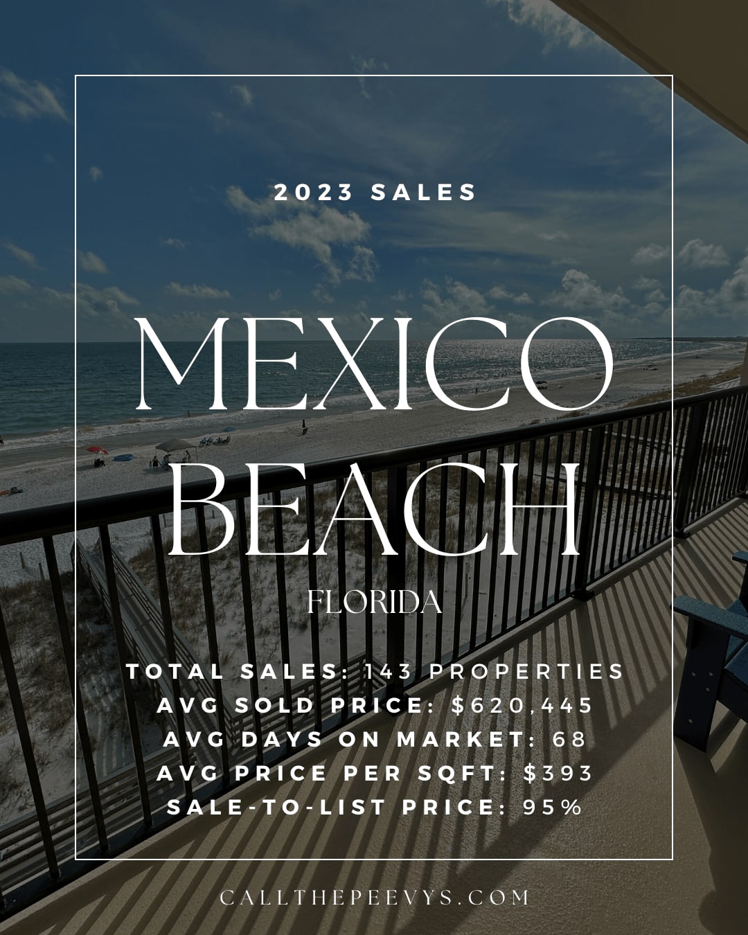 Nestled along the Gulf of Mexico, Mexico Beach has charmed residents and visitors alike with its pristine white sands and laid-back atmosphere. In 2023, the real estate market here saw a surge in sales, reflecting the allure of beachfront living. Residents enjoy a variety of water activities, from paddleboarding to fishing, making Mexico Beach a haven for outdoor enthusiasts. Mexico Beach had 143 total property sales for the year with an average sale price of just over $620,000. The average total days on market added up to 68 days, and an average price per square foot of $393. The highest sale price Mexico Beach saw for 2023 was $3,500,000!