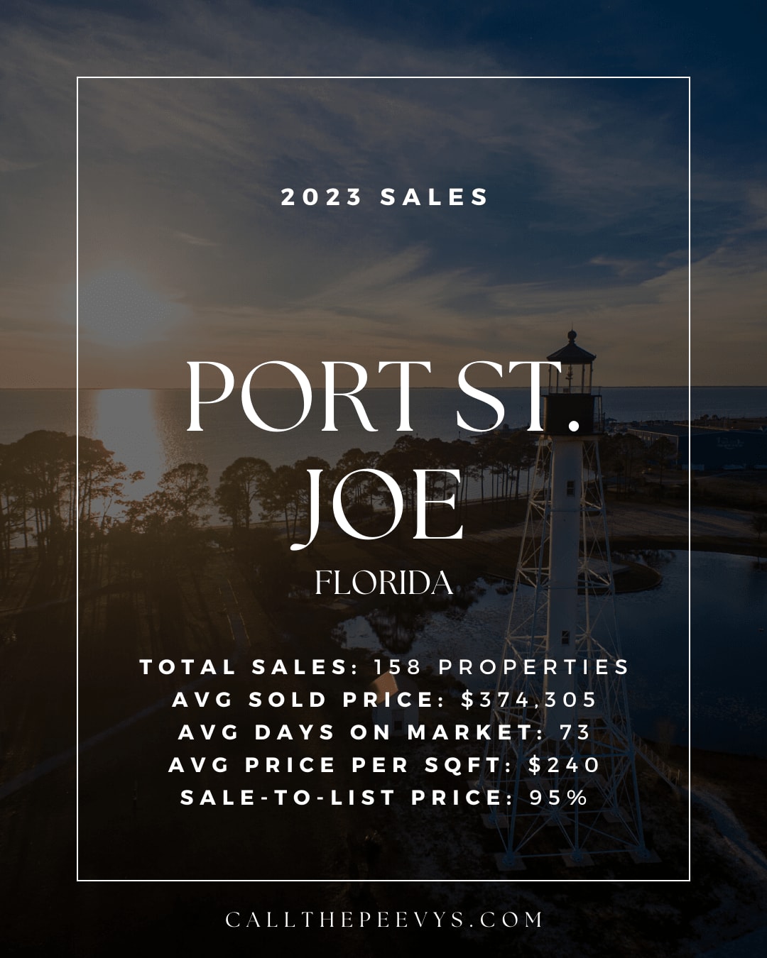 With its historic charm and waterfront allure, Port St. Joe remains a sought-after destination for real estate. The market here in 2023 showcased a thriving community with a love for coastal living. Residents engage in water sports, visit the local marina, and explore the historic downtown, creating a rich and vibrant lifestyle. Port St. Joe saw 158 total sales in its market for 2023 with an average sale price of just shy of $375,000. The average days on market was 73 days, and the highest priced sale in Port St. Joe was $1,175,000 for 2023!