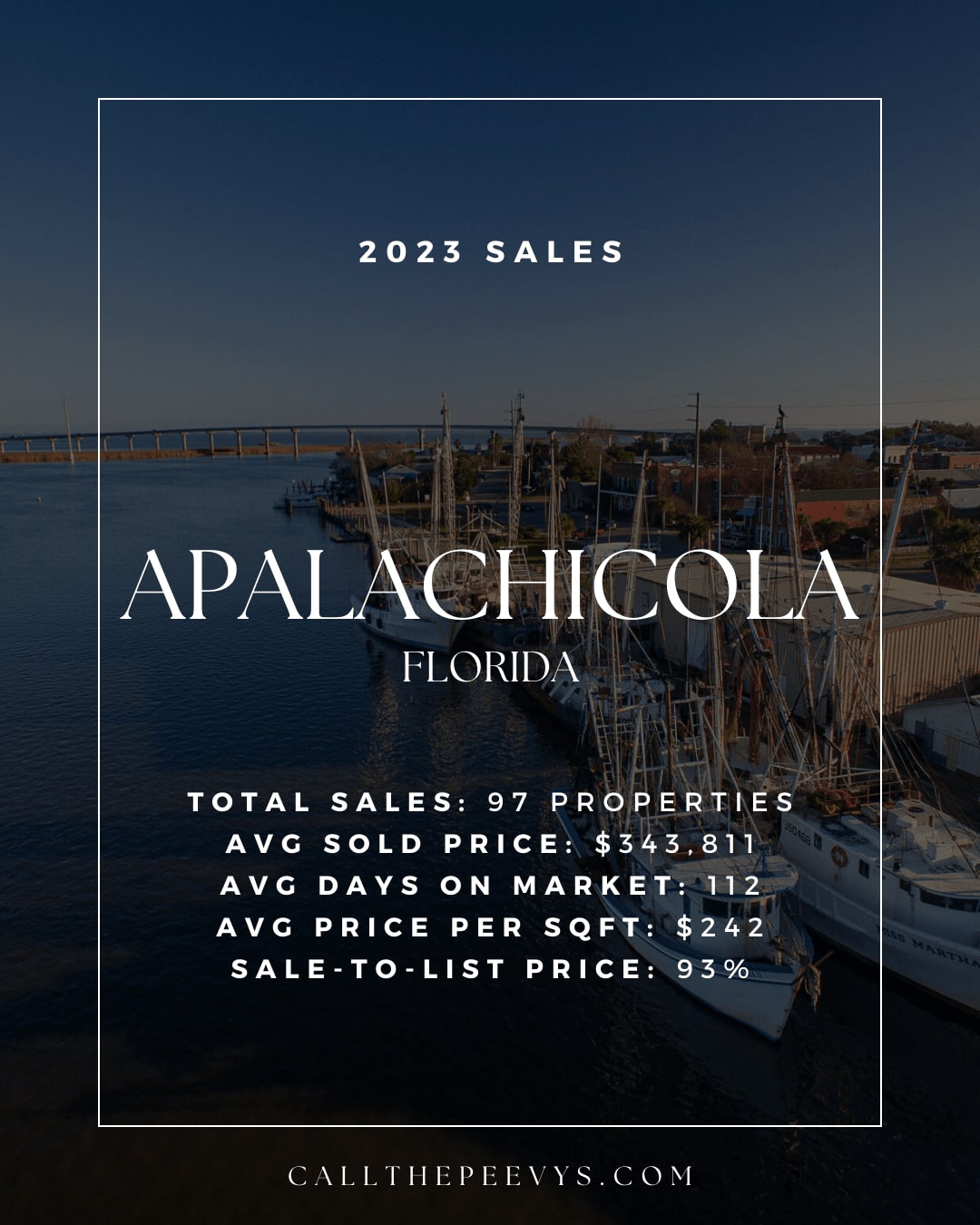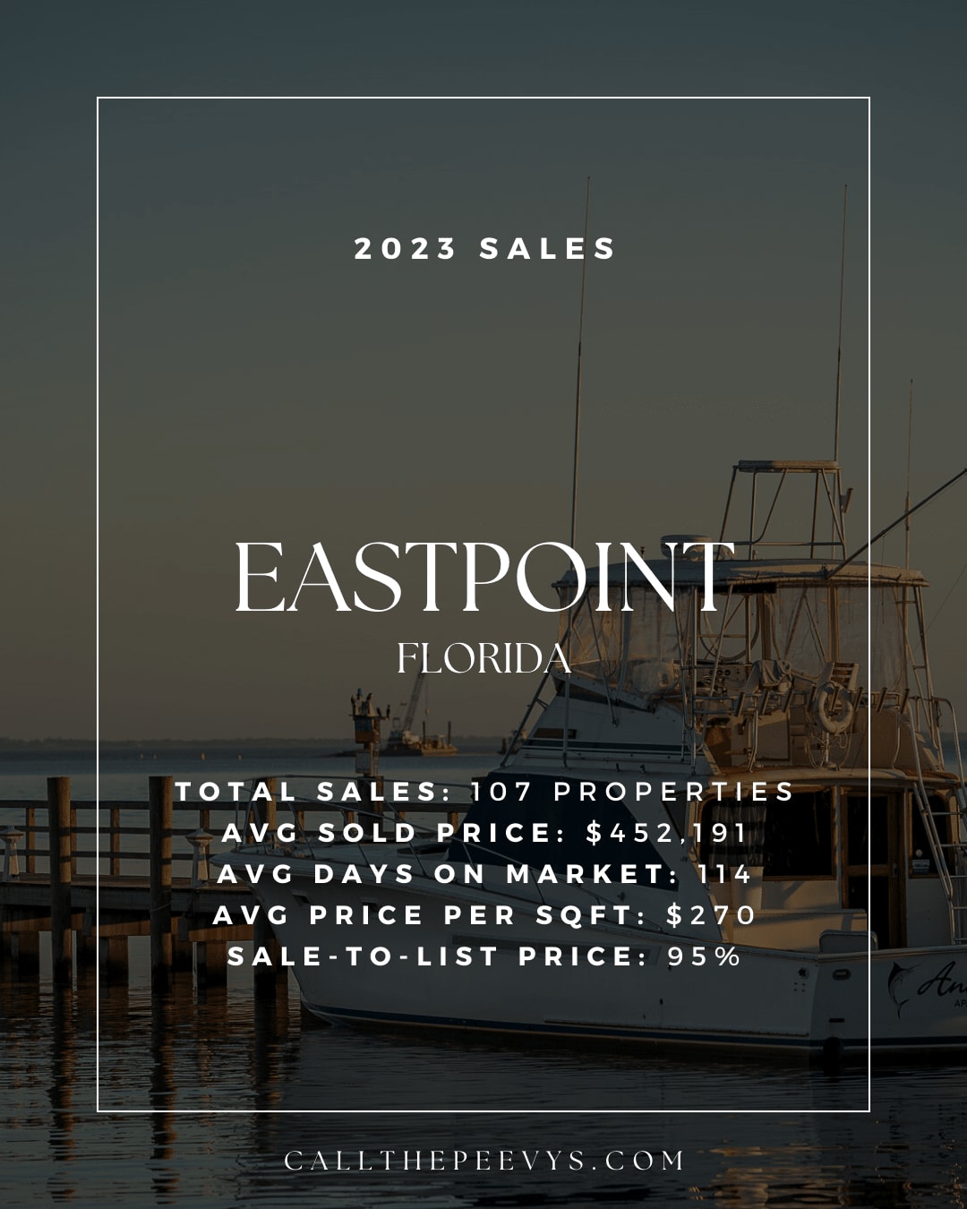 Nestled at the intersection of Apalachicola Bay and the Gulf of Mexico, Eastpoint’s real estate market reflected the town’s charm and accessibility in 2023. Boasting a strong sense of community, residents engage in fishing, water sports, and local festivities that make Eastpoint a hidden gem in Franklin County. Eastpoint saw an impressive highest sale of $1,487,500 as its highest sale for 2023 with an average sale price around $450,000. Average days on market came to 114 days with an average price per square foot of $270.