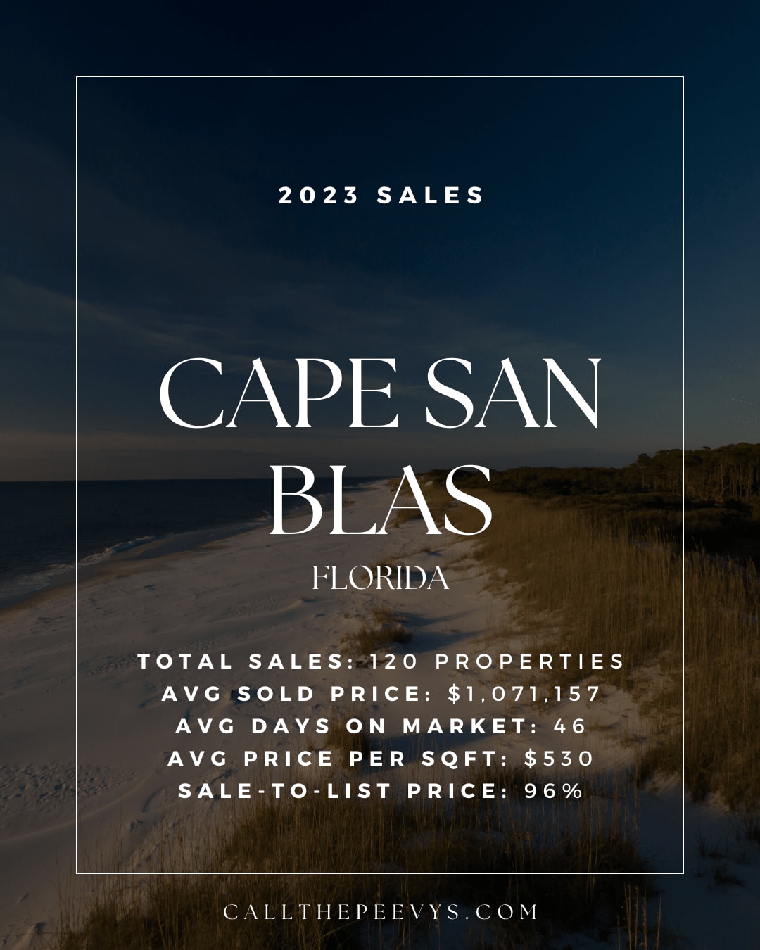 Cape San Blas, known for its serene beaches and pet-friendly environment, witnessed robust real estate sales in 2023. The market here appeals to nature lovers and pet enthusiasts, offering a range of outdoor activities such as hiking in the St. Joseph Peninsula State Park or enjoying sunset bonfires along the shore. Cape San Blas continues to be a market leader for the Forgotten Coast with an average sale price of $1,071,157, and an average price per square foot of $530. 2023 saw 120 total sales on the Cape with an average days on market of 46–one of the lowest average DOM in our local markets! The highest sale price came to $3,500,000!