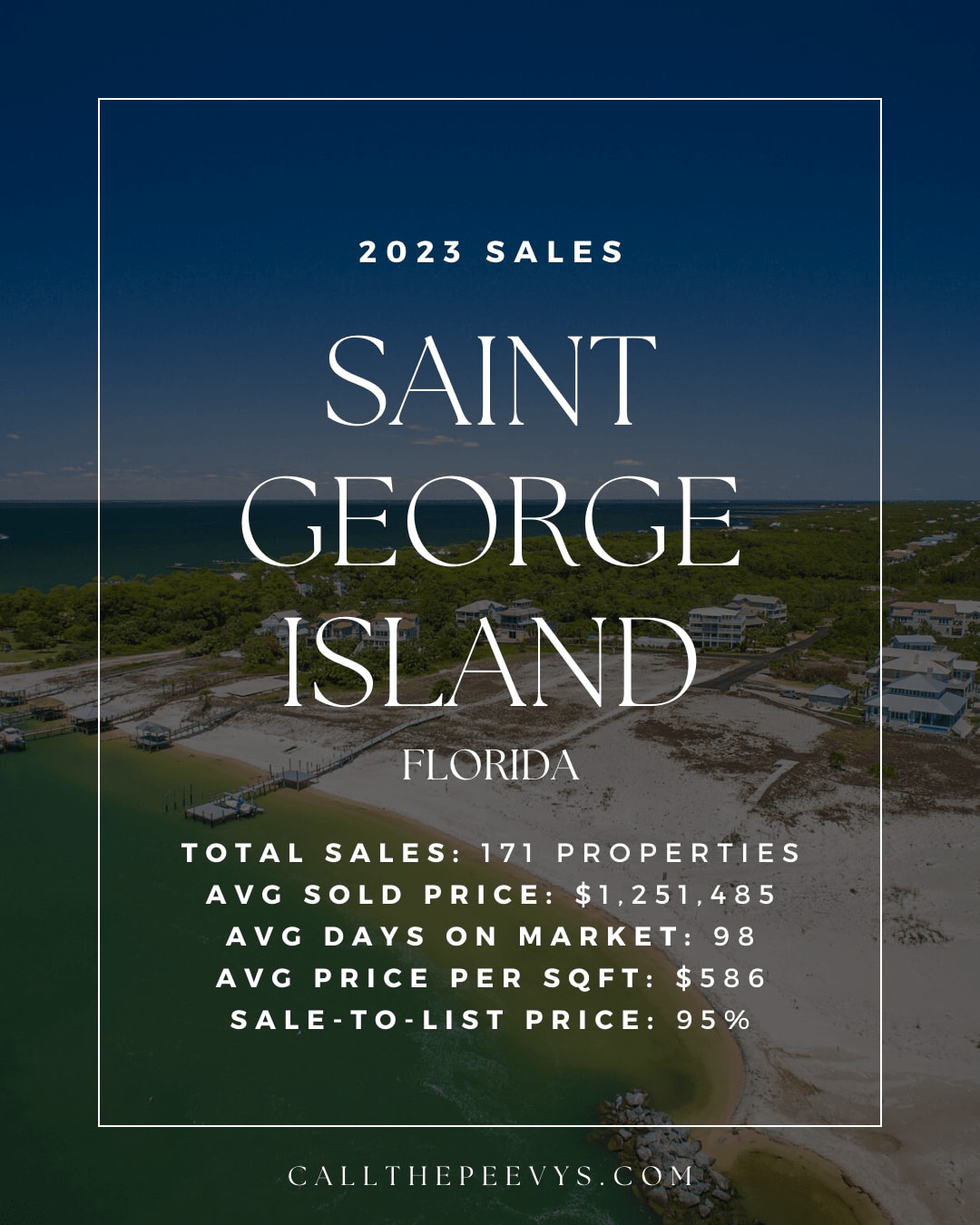 As one of Florida’s premier barrier islands, St. George Island saw continued real estate success in 2023. This market attracts beach lovers and nature enthusiasts with its miles of pristine coastline and diverse wildlife. Residents relish beachcombing, bird watching, and participating in island events that foster a sense of community. St. George Island continues to be the market leader of Florida’s Forgotten Coast with a MASSIVE highest price sale of $5,500,000!!! The Island saw 171 properties sold for the year with an average sold price of at an impressive $1.25MM! Average price per square foot came to $586 for the year, and the average days on market was seen at 98 days.