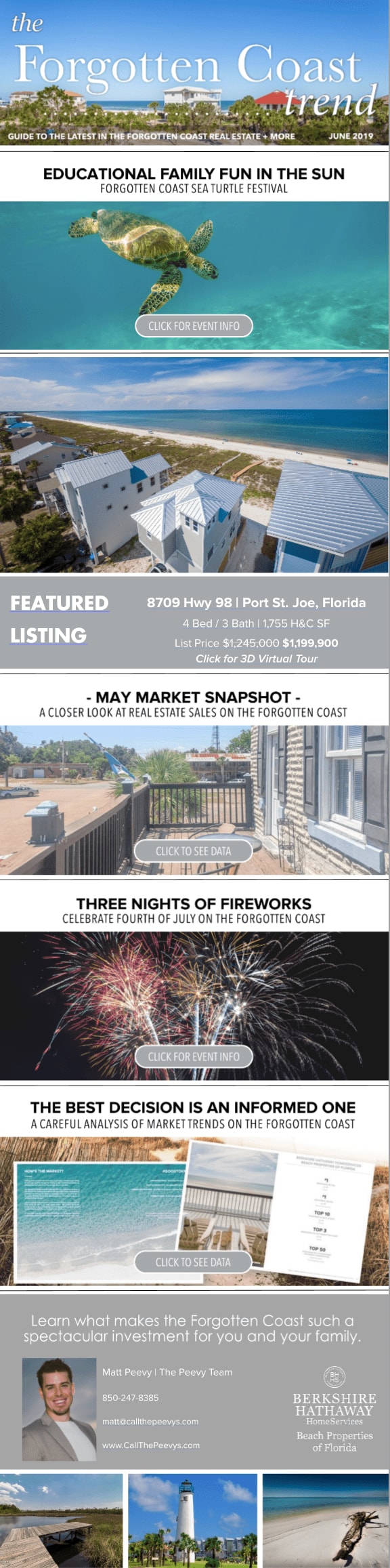 The June edition of The Forgotten Coast Trend is now out! Click the image below to see the May Market Snapshot, upcoming area events, and more! All about real estate and lifestyle for Gulf and Franklin counties, and Florida’s beautiful Forgotten Coast.